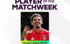 森林半场0-1落后,吉布斯-怀特第62分钟扳平比分,7分钟后再入精彩一球完成反超,随后用一记头球完成职业生涯首个帽子戏法。